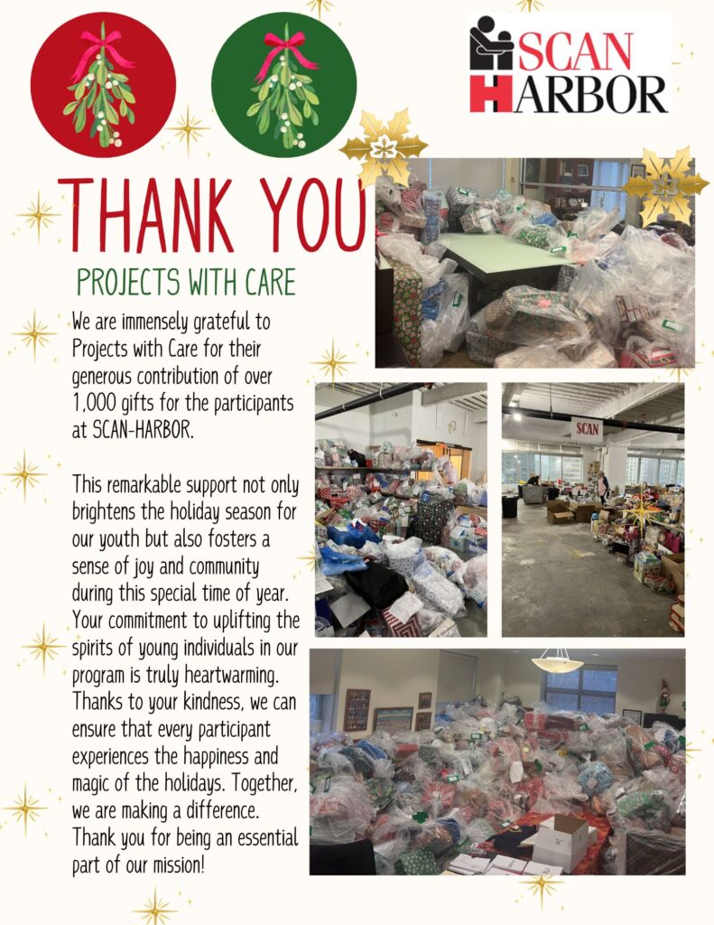 We are immensely gratful to Projects with Care for their generous contribution of over 1,000 gifts for participants at SCAN-Harbor. This remarkable support not only brightens the holiday season for our youth, but also fosters a sense of joy and community during this special time of year. Thanks to your kindness, we can ensure that every participant experiences the hapiness and magic of the holidays.